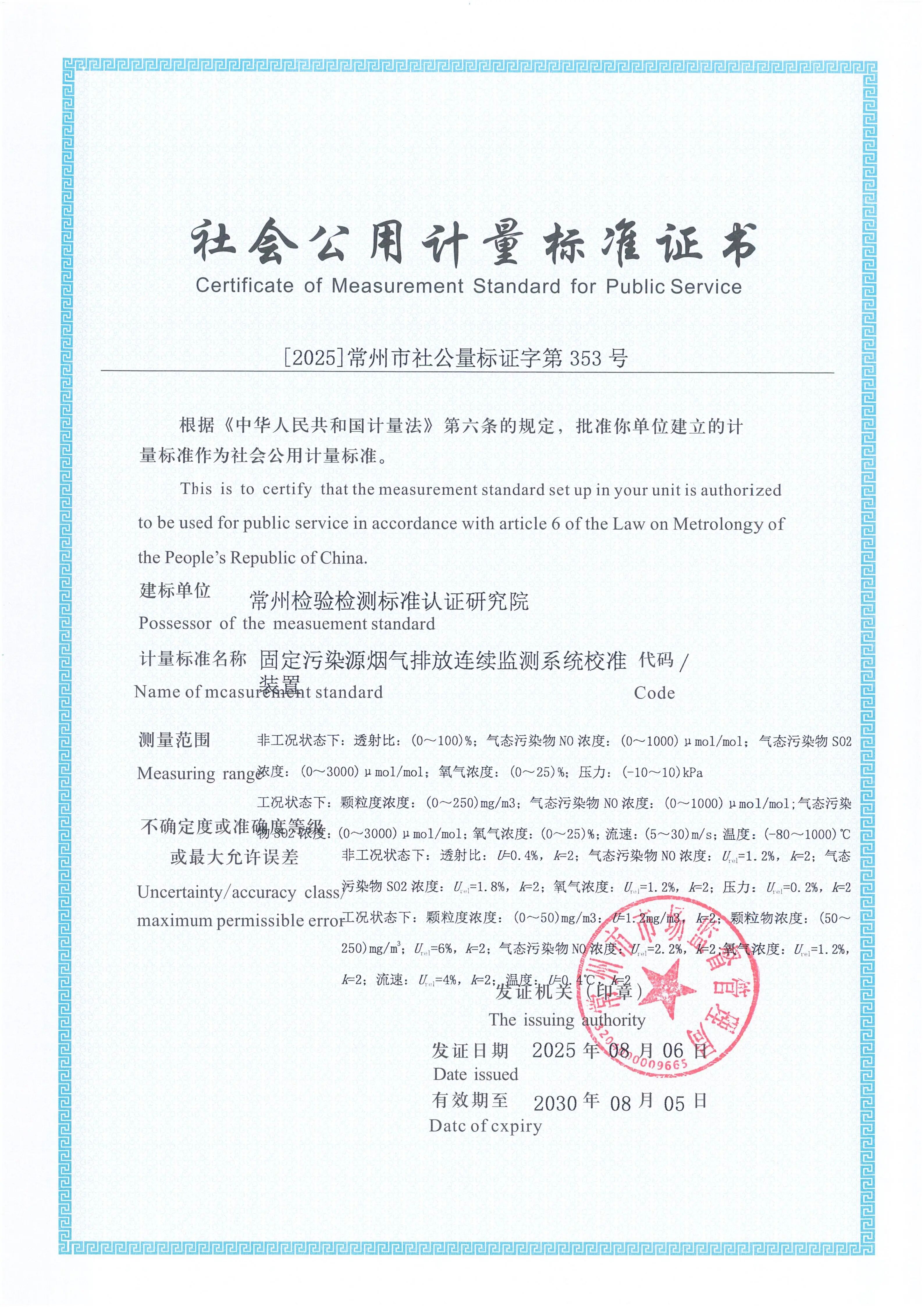 近期,市市场监管局批准启用固定污染源烟气排放连续监测系统校准装置([2025]常州市社公量标证字第353号),该项社会公用计量标准可对固定污染源烟气排放连续监测系统开展校准工作,填补常州相关领域量值传递与溯源能力的空白。